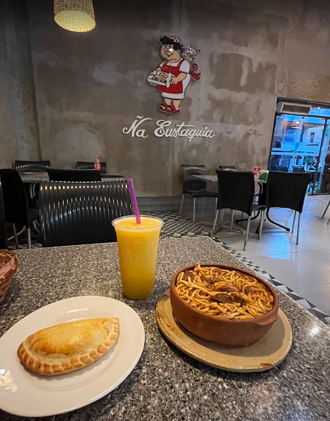 Para manter a tradição de provar pratos locais, o jantar de despedida foi no Na Eustaquia, um restaurante especializado em pratos com massa e batata, que acabei entrando por pura curiosidade e só depois descobri que é um dos mais bem avaliados da capital. Escolhi o “estofado”, prato feito à base de carne cozida e molho de tomate, guarnecido com espaguete e uma empanada chilena (as empanadas estiveram presentes em absolutamente todas as minhas refeições durante esses dias no Paraguai rsrs).