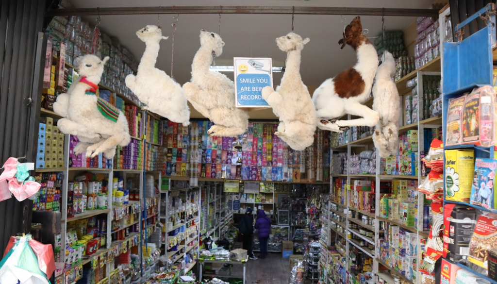 Uma das várias lojas do mercado onde são oferecidos os sullus, fetos de lhama dissecados.