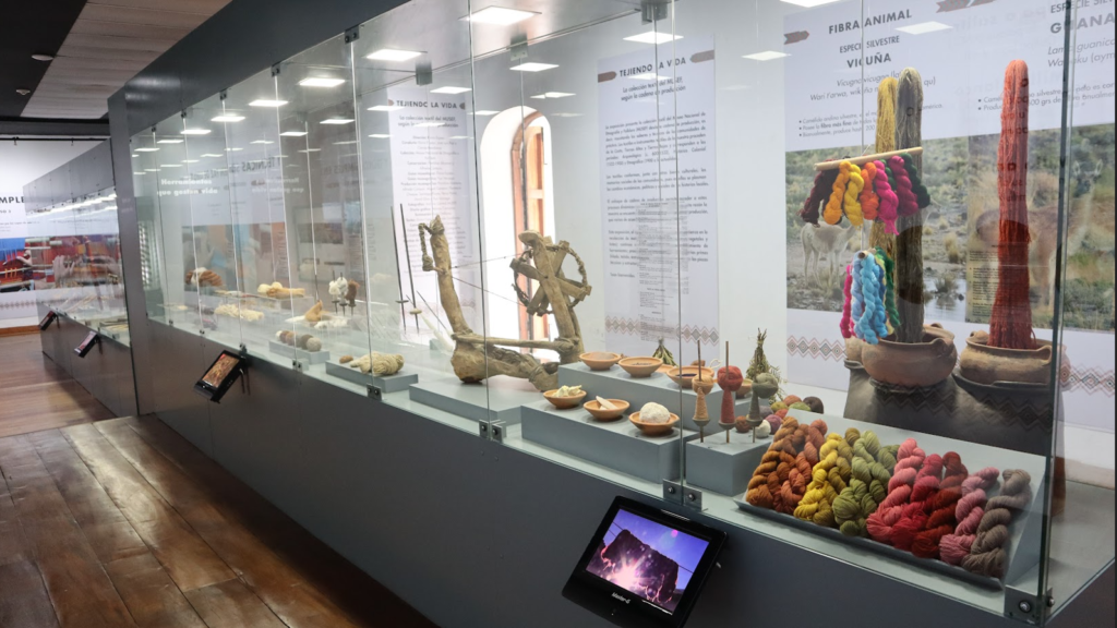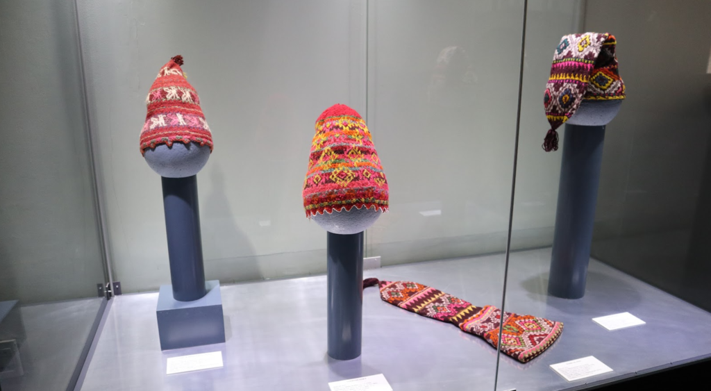 Uma das sessões que mais achei interessante do museu foi a sessão que relacionava a importância das lhamas e alpacas para a sobrevivências dos povos nativos desde muito antes da chegada dos colonizadores, com a produção de roupas e tecidos por meio da sua lã (sendo introduzido posteriormente o cultivo do algodão e de outras plantas), para que se protegessem das baixas temperaturas, além da identificação dos grupos culturais através da utilização dos gorros arqueológicos (como os da imagem acima). Mais do que apenas uma proteção para a cabeça, os gorros permitiam identificar os grupos através das suas atividades, classes sociais e localizações.