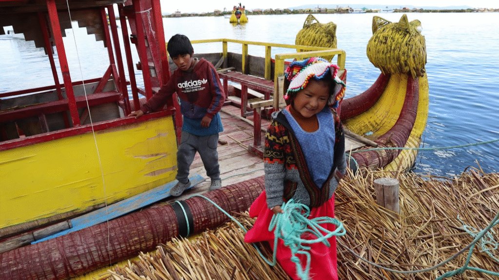 Em um outro momento da visita, fomos conduzidos a uma outra ilha, mas dessa vez através de embarcações fabricadas nas ilhas e feitas a base de totora. Chegando nessa nova ilha, fomos recebidos por simpáticos mini marinheiros (ou seria mini “lagueiros”, já que estamos em um lago? rsrs), que trataram de amarrar a embarcação para que descêssemos em segurança. Essas embarcações não possuem nenhum tipo de motor de propulsão, sendo “empurradas” através de chalanas tradicionais motorizadas. Quando usadas para transportar poucas pessoas, a propulsão é feita à remo.