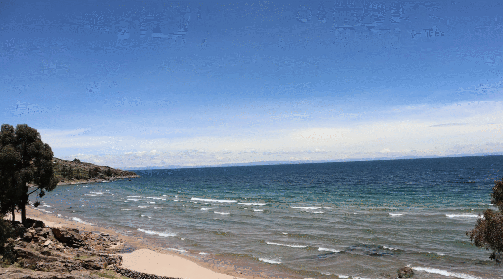 Uma coletânea de tons de azul nas águas do Titicaca, nos primeiros passos na ilha