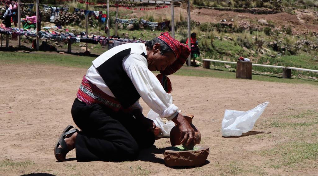 A comunidade de Taquile é composta por cerca de 2.500 pessoas e preserva tradições muito antigas, com forte influência Inca. Eles mantêm um modo de vida baseado em costumes agrícolas e tecelagem, e o uso do Quechua, a língua nativa, é predominante, embora o espanhol também seja falado. Sobre a tecelagem, os tecidos de Taquile são mundialmente conhecidos. Tanto homens quanto mulheres participam da tecelagem manual, criando peças complexas como ponchos, chullos (chapéus de lã) e xales. A tecelagem em Taquile é considerada uma das mais refinadas do mundo, e a ilha recebeu o reconhecimento da UNESCO em 2005 como parte do Patrimônio Cultural Imaterial da Humanidade.