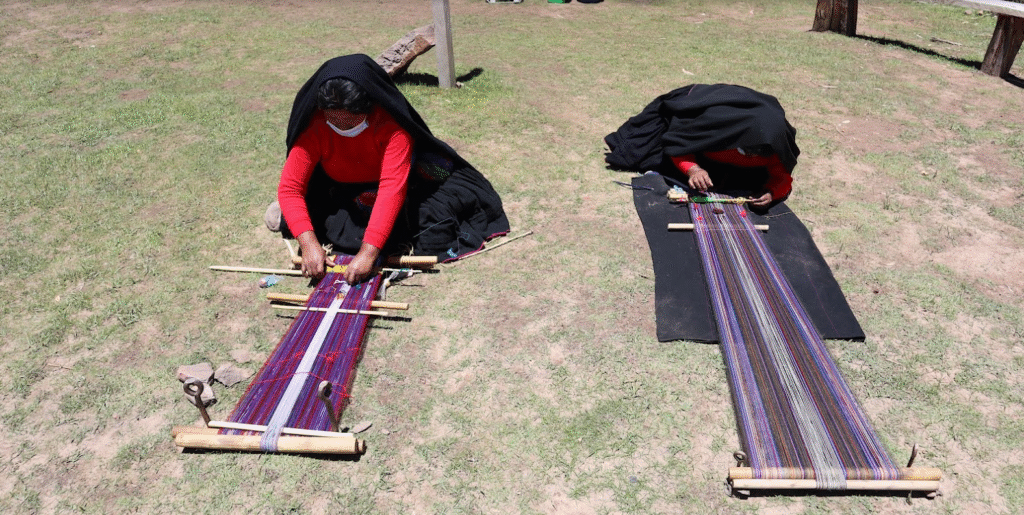 Mulheres exercendo a tecelagem de peças em lã, de forma totalmente manual