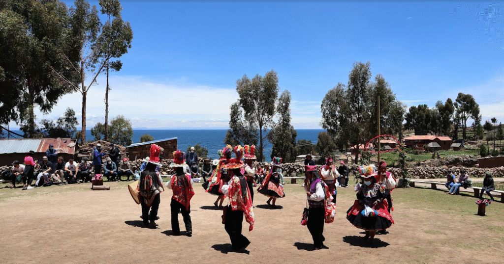As festas tradicionais em Taquile são momentos importantes de celebração. Uma das mais destacadas é a Fiesta de la Virgen del Carmen, quando a comunidade realiza danças, músicas e rituais para honrar a Virgem de Carmen. Esses eventos são uma verdadeira expressão cultural e atraem visitantes que desejam conhecer mais profundamente a vida local. Outro costume bastante peculiar dessa ilha, principalmente se comparado com comunidades mais conservadoras, é de que casais vivem juntos antes de se casar oficialmente — prática aceita e chamada “servinacuy”. O casamento é uma celebração coletiva que envolve toda a comunidade, com muita dança, comida e música.