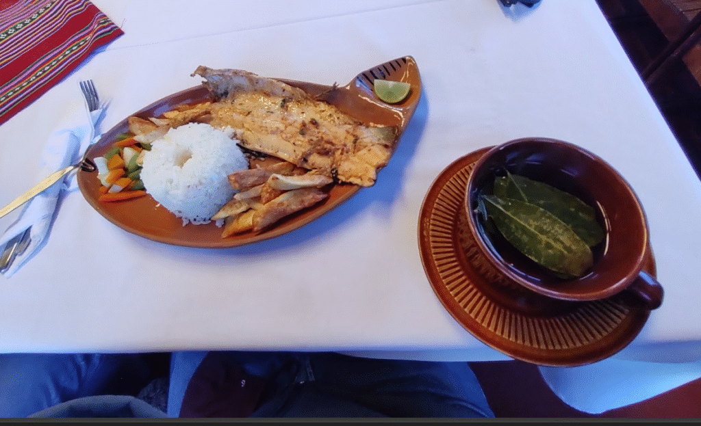 Pausa para o almoço: Uma sopa de entrada, seguido por uma porção de truta com legumes, além de um tradicional chá de folhas de coca