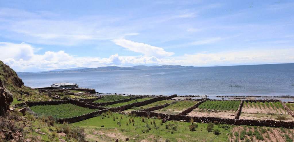 Apesar das condições climáticas desafiadoras da região, os habitantes de Taquile mantêm técnicas agrícolas ancestrais, herdadas dos incas, que garantem a produção de alimentos e a preservação do solo. Como se pode ver na imagem abaixo, é comum o uso dos terraços agrícolas, chamados de andenes, que são estruturas de pedra construídas nas encostas da ilha. Eles evitam a erosão, conservam a umidade do solo e aproveitam melhor o terreno acidentado, sendo uma herança dos incas amplamente usada com eficácia até os dias atuais. Dentre as principais espécies cultivadas, estão as batatas, a quinoa, o milho e a cebola.