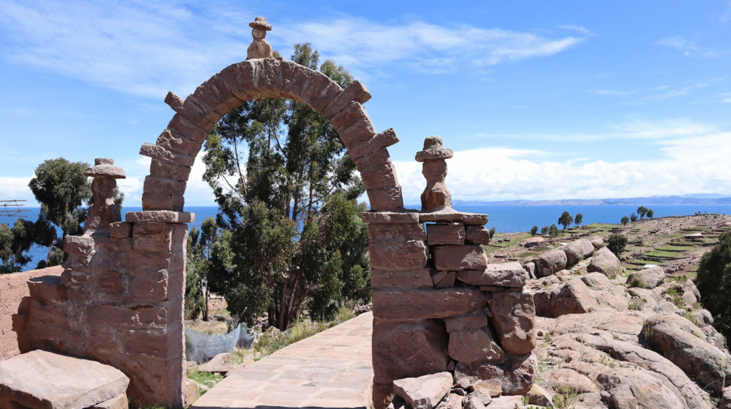 Um dos cartões postais da ilha é o arco de Taquile. O arco funciona como um portal simbólico: ao atravessá-lo, o visitante entra em um espaço onde as regras e tradições ancestrais são respeitadas. Marca a transição entre o mundo moderno e a vida comunitária e espiritual andina. É decorado com símbolos andinos esculpidos na pedra, como o sol, a lua e figuras da natureza, que representam a cosmovisão dos Andes. Para quem visita a ilha, passar por esse arco é mais do que entrar num lugar: é entrar num modo de vida diferente, onde as tradições andinas continuam vivas.