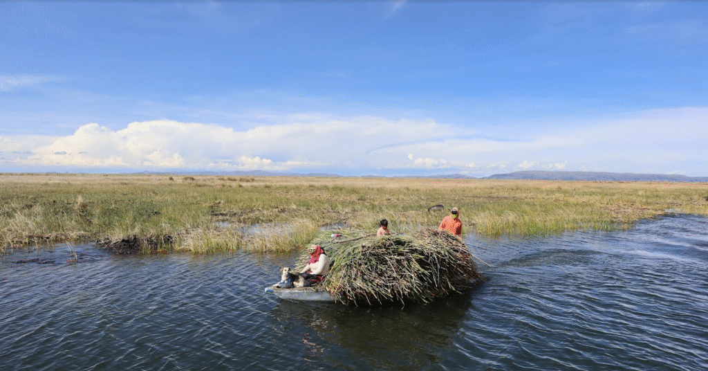 Logo após a visita ao arco, chegou o momento de encerrar o passeio pela ilha. Nossa embarcação já estava nos aguardando no local em que havíamos descido, sendo iniciada a navegação de volta à Puno. Dessa vez as águas estavam bem mais tranquilas, sendo possível contemplar as paisagens até mesmo pela área externa da embarcação. No caminho, encontramos diversos habitantes locais e da ilha de Uros realizando atividades de pesca e até mesmo de coleta da totora, como na imagem abaixo. Possivelmente para uso na substituição das bases das ilhas.