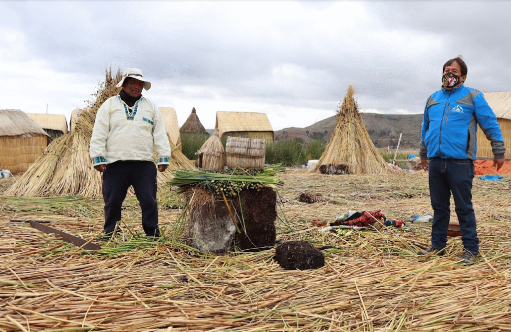 A vida na Ilha de Uros é totalmente adaptada ao ambiente. Os habitantes da ilha praticam uma agricultura de subsistência, cultivando batatas, milho, quinua e outras plantas que conseguem cultivar nas pequenas porções de terra nas ilhas. Além disso, eles pescam para complementar sua alimentação, utilizando barcos feitos também de totora. Outro fato curioso é sobre a sua organização política, baseada em uma estratégia comunitária de cooperativismo, com uma liderança informal e descentralizada, conforme nos explicou o guia. As decisões são tomadas coletivamente, com ênfase no consenso e no respeito às tradições. As ilhas possuem uma espécie de “líder” que é escolhido anualmente de forma informal. Essa pessoa não possui poderes absolutos, mas sua função é coordenar as atividades, representar a comunidade em questões externas e tomar decisões importantes relacionadas ao bem-estar coletivo. Na ocasião, o líder (à esquerda, na foto abaixo) nos recebeu assim que o barco atracou na ilha.
