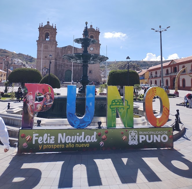 Falando um pouco mais sobre a cidade, Puno está localizada no sul do Peru, à beira do Lago Titicaca, o lago navegável mais alto do mundo. Conhecida como a “capital folclórica do Peru”, Puno é famosa por sua rica cultura indígena, especialmente as tradições dos povos Aymara e Quechua. A cidade é também um importante ponto de partida para explorar o lago e suas ilhas, como a Ilha de Uros, habitada por povos que vivem em ilhas artificiais feitas de totora (que veremos ainda nesse post). Além de sua beleza natural, Puno é conhecida por suas festas tradicionais, como a Festa de la Candelaria, que acontece em fevereiro e é uma das maiores celebrações religiosas e folclóricas do país, reunindo danças, música e vestimentas típicas. A cidade possui cerca de 150 mil habitantes, mas se considerarmos os habitantes das zonas rurais e povoados próximos, esse número pode superar os 200 mil.