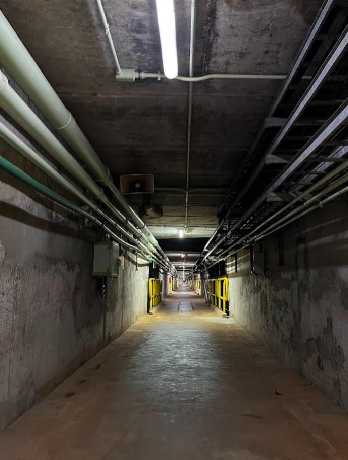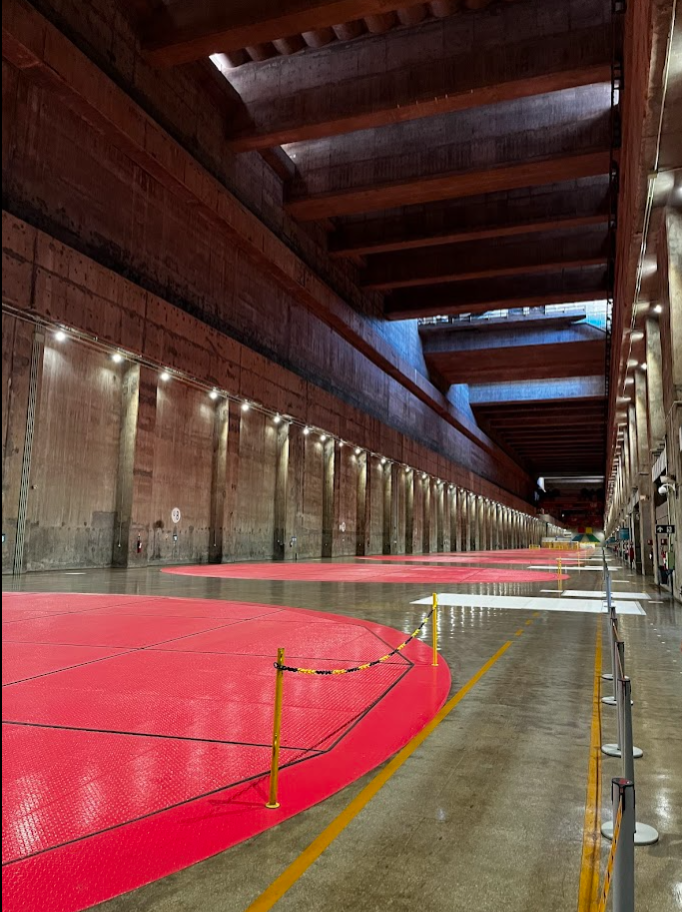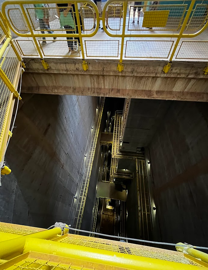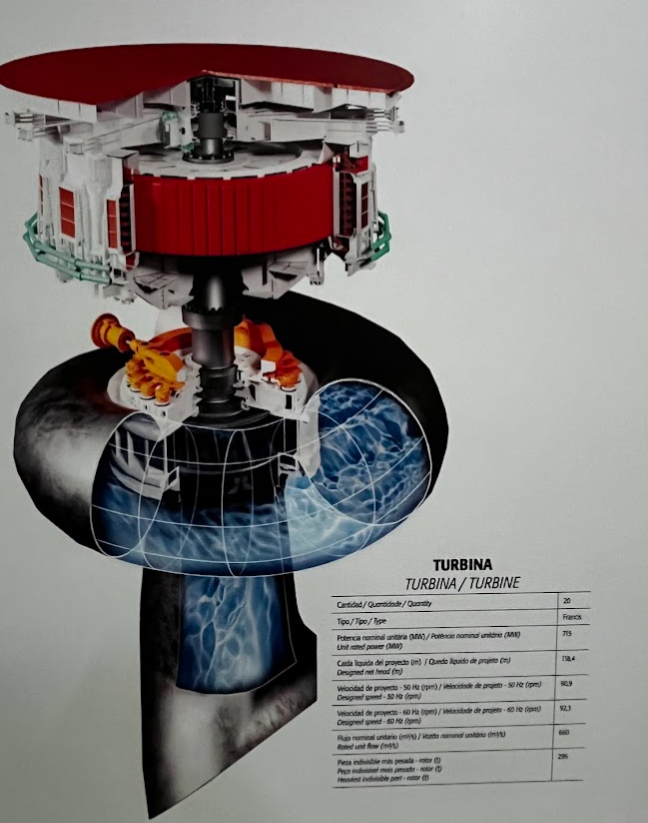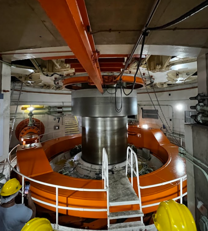 Dando sequência na visita, é chegado o momento de acessar as galerias da usina. Logo na chegada, nos deparamos com os dutos forçados, que são parte importante no processo de geração de energia baseada no princípio de Bernoulli (hidrodinâmica), que considera a relação entre pressão, volume e altura. De forma prática, a água do reservatório está em uma posição elevada (energia potencial gravitacional alta). Ao descer pelos dutos, a energia potencial se transforma em energia cinética, aumentando a velocidade da água. Isso cria um fluxo de alta pressão que movimenta as turbinas da usina, gerando energia elétrica. Para se ter ideia da dimensão desses dutos, basta perceber o tamanho desses em ralação aos carros, na no canto inferior direito da imagem.
