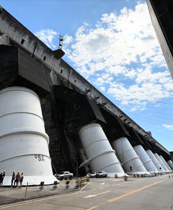 Finalizada a visita no interior da usina, a próxima parada é no mirante do vertedouro, o famoso mirante com os letreiros da usina. É uma parada rápida apenas para fotos e contemplação, garantindo uma vista bem interessante dos vertedouros.